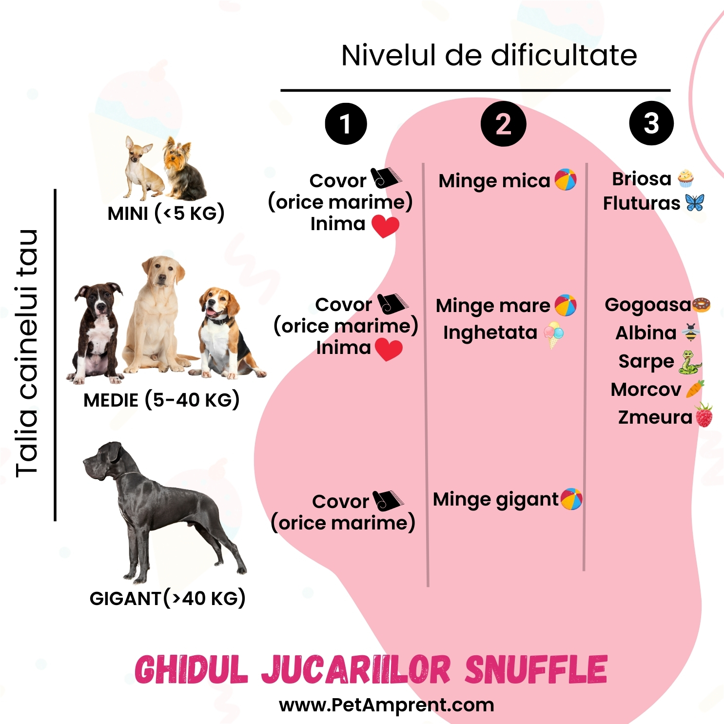 Ușor: Covorașele, perfecte pentru câinii aflați la începutul aventurii olfactive.Mediu: Mingi și înghețate, cu pliuri rotunde, oferind spațiu suficient pentru căutare.Dificil: Brăduţi, Gogoși, fructe și legume pentru câini de talie medie și mare, brioșe pentru câini de talie mică – provocări satisfăcătoare pentru nasurile curioase.